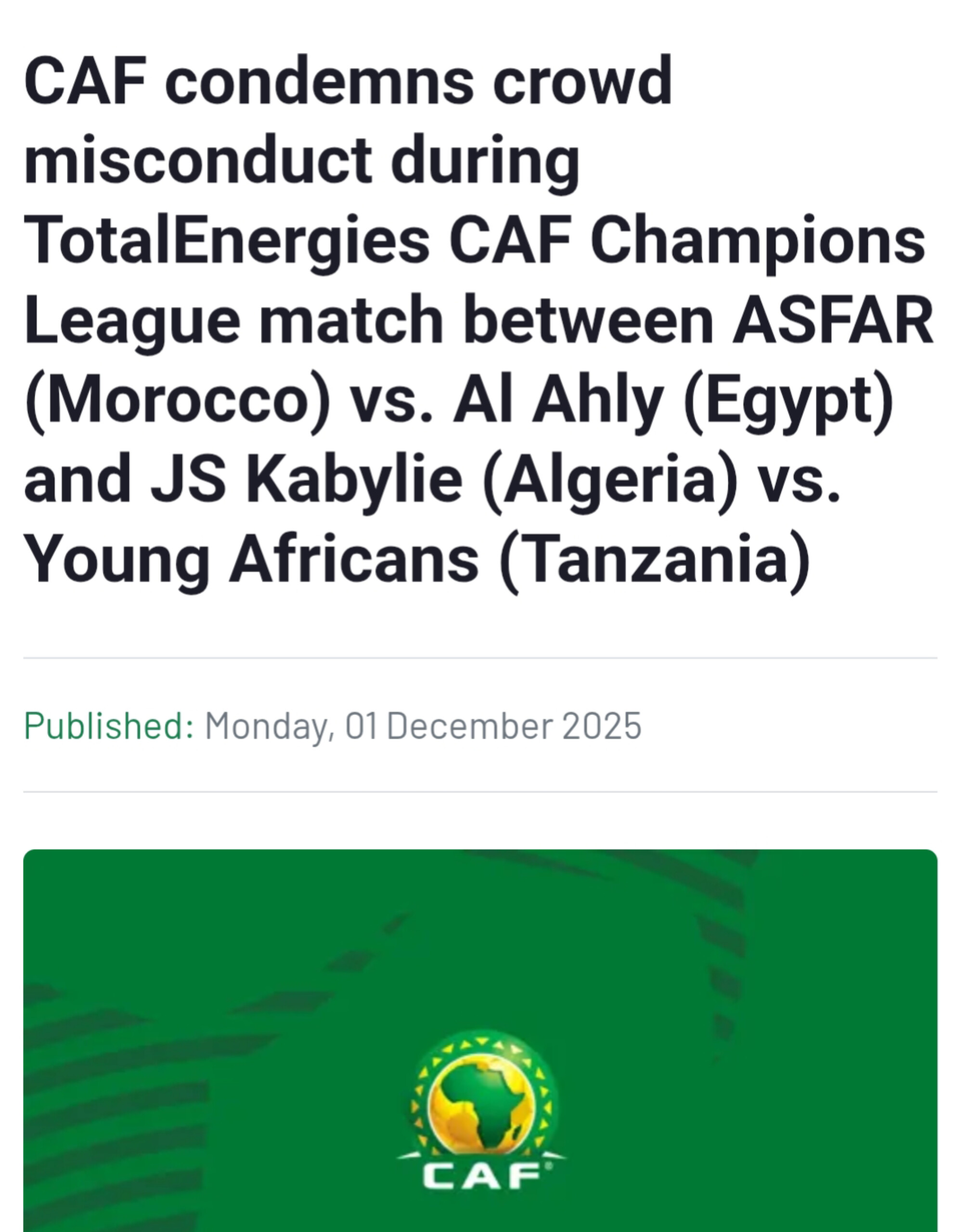 CAF imetoa taarifa kuwa inalaani vikali uvunjaji mkubwa wa usalama uliotokea wakati wa mechi ya Ligi ya Mabingwa ya TotalEnergies CAF iliyochezwa tarehe 28 Novemba 2025 kati ya ASFAR (Morocco) dhidi ya Al Ahly (Misri) na JS Kabylie (Algeria) dhidi ya Young Africans (Tanzania).