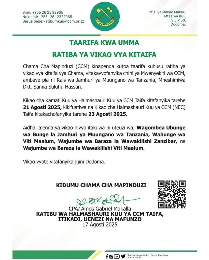 Kwa mujibu wa taarifa iliyotolewa Agosti 17, 2025 na Katibu wa Halmashauri Kuu ya CCM Taifa, Itikadi, Uenezi na Mafunzo, CPA Amos Gabriel Makalla, kikao cha Kamati Kuu ya Halmashauri Kuu ya CCM Taifa kimepangwa kufanyika tarehe 21 Agosti 2025, kikifuatiwa na kikao cha Halmashauri Kuu ya CCM Taifa (NEC) kitakachofanyika tarehe 23 Agosti 2025.