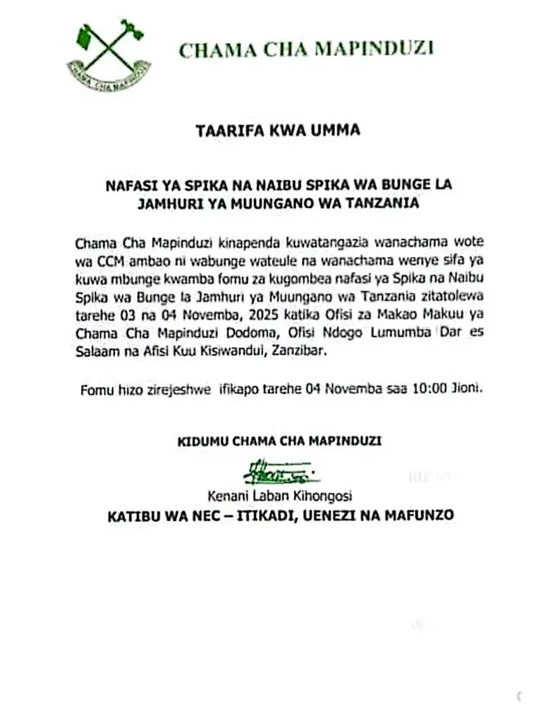 Chama Cha Mapinduzi (CCM), kimetangaza kwa Wanachama ambao ni Wabunge wateule na Wanachama wenye sifa za kuwa Mbunge, kuwa fomu za kugombea nafasi ya Spika na Naibu Spika wa Bunge la Jamhuri ya Muungano wa Tanzania zimeanza kutolewa leo Novemba 03 na kesho Novemba 04 Novemba, 2025 katika Ofisi za Makao Makuu ya Chama hicho Dodoma, Ofisi Ndogo Lumumba Dar es Salaam na Afisi Kuu Kisiwandui, Zanzibar.