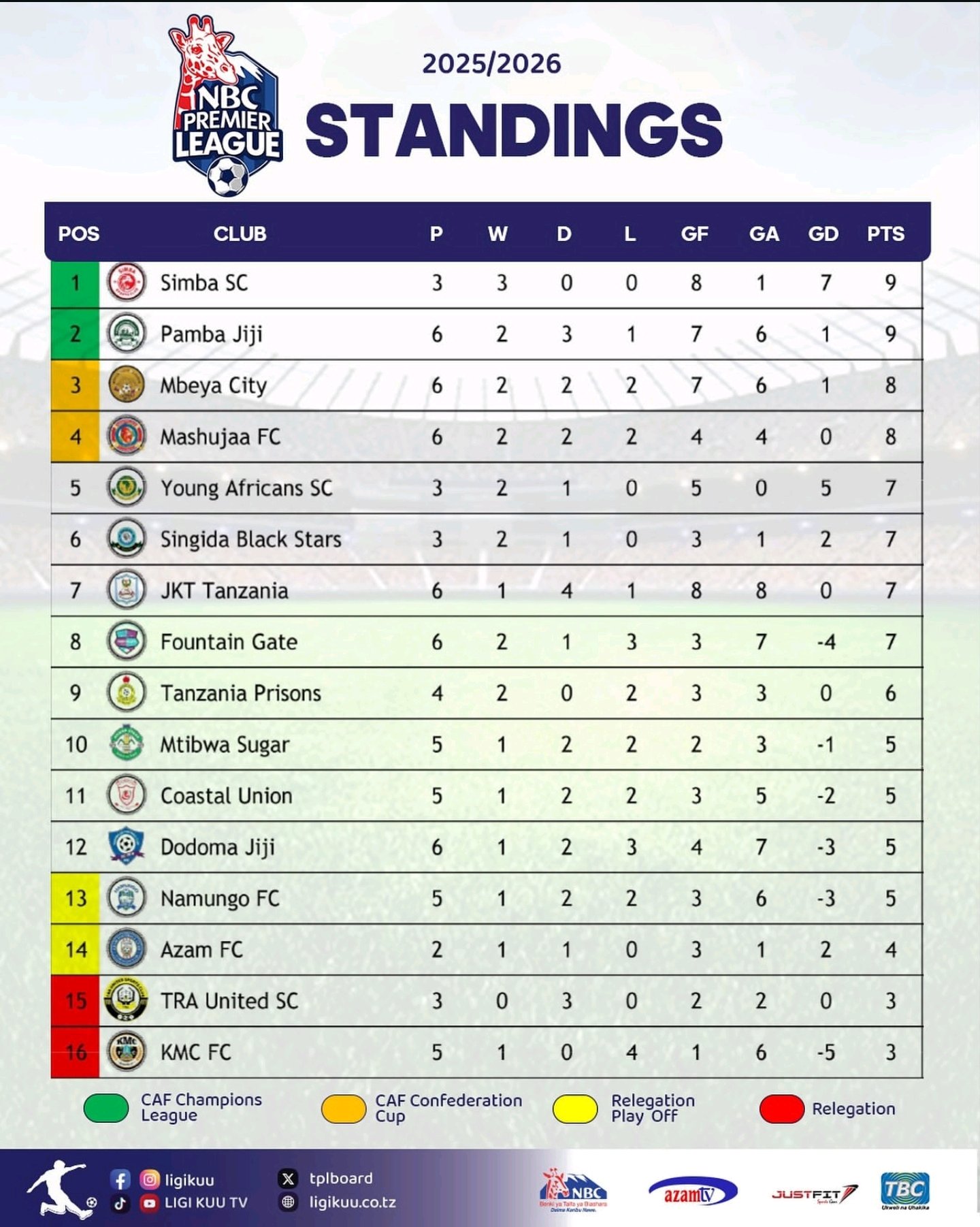 Ligi Kuu ya NBC ya msimu wa 2025/2026 inaendelea kushika kasi, huku timu zikipambana vikali kutafuta ubingwa na nafasi za kushiriki michuano ya kimataifa. Kwa sasa, Simba SC inaongoza jedwali ikiwa na pointi 9 baada ya kushinda mechi tatu, zote ikiwa ni za ushindi, bila kupoteza wala kutoka sare. Timu hiyo inaongoza kwa tofauti kubwa ya mabao ya kufunga na kufungwa, ikiwa na mabao 8 ya kufunga na 1 tu ya kufungwa.