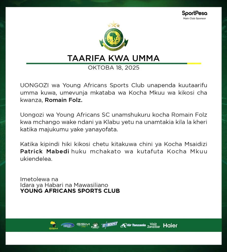 Uongozi wa Klabu ya Yanga umevunja mkataba na Kocha Mkuu, Romain Folz.