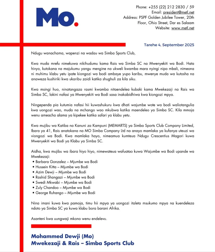 Akitangaza uamuzi huo leo, Septemba 4, 2025, MO alisema amebanwa na majukumu binafsi na mara nyingi kukosa muda wa kushiriki kikamilifu kwenye shughuli za kila siku za klabu, hivyo akabaini nafasi hiyo inapaswa kushikiliwa na mtu aliye karibu zaidi na mwenendo wa klabu.