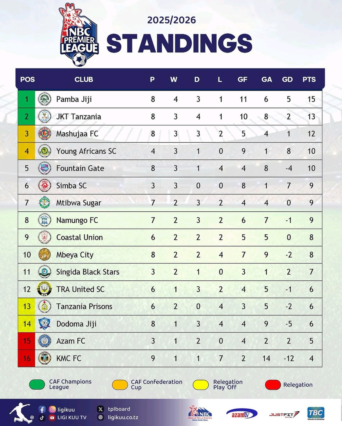 Msimu mpya wa Ligi Kuu ya NBC 2025/2026 unaendelea kushika kasi huku ushindani ukizidi kuwa mkali katika wiki za mwanzo. Timu mbalimbali zimeonyesha uwezo mkubwa, na msimamo wa ligi unaoonekana hivi sasa unadhihirisha jinsi timu zinavyopambana kuwania nafasi za juu pamoja na kuepuka presha ya mkiani. Baada ya michezo kadhaa kuchezwa, Pamba Jiji imejitokeza kuwa kinara, ikiongoza ligi kwa pointi 15 baada ya kushuka dimbani mara 8.