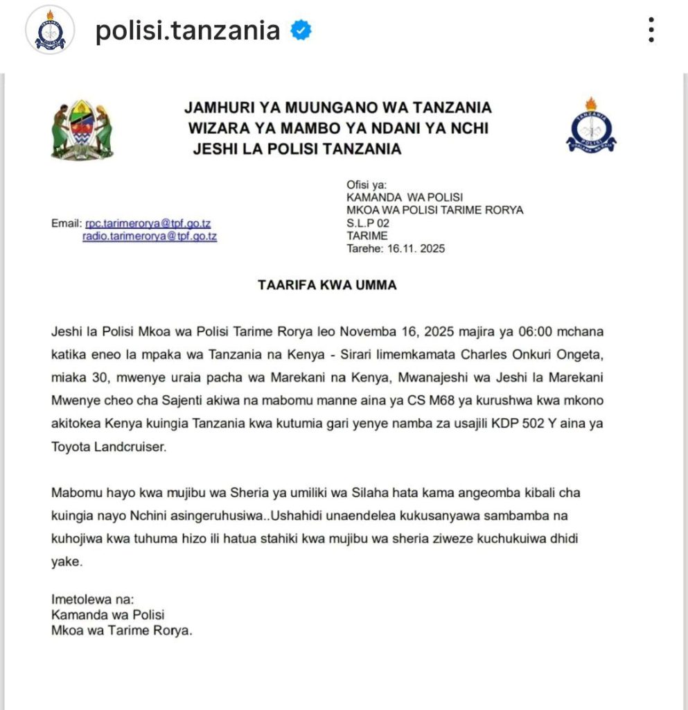 Jeshi la Polisi Mkoa wa Tarime/Rorya limethibitisha kumkamata Sajenti wa Jeshi la Marekani, Charles Onkuri Ongeta, mwenye umri wa miaka 30, baada ya kupatikana akiwa na mabomu manne (4) ya machozi. Ongeta, ambaye anatajwa kuwa na uraia pacha wa Marekani na Kenya, alikamatwa siku ya Jumapili, Novemba 16, 2025, saa sita kamili mchana.