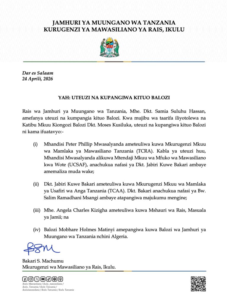 Rais wa Jamhuri ya Muungano wa Tanzania, Samia Suluhu Hassan, amefanya uteuzi na mabadiliko ya viongozi mbalimbali serikalini, ikiwemo kumpangia kituo kipya cha kazi Balozi.