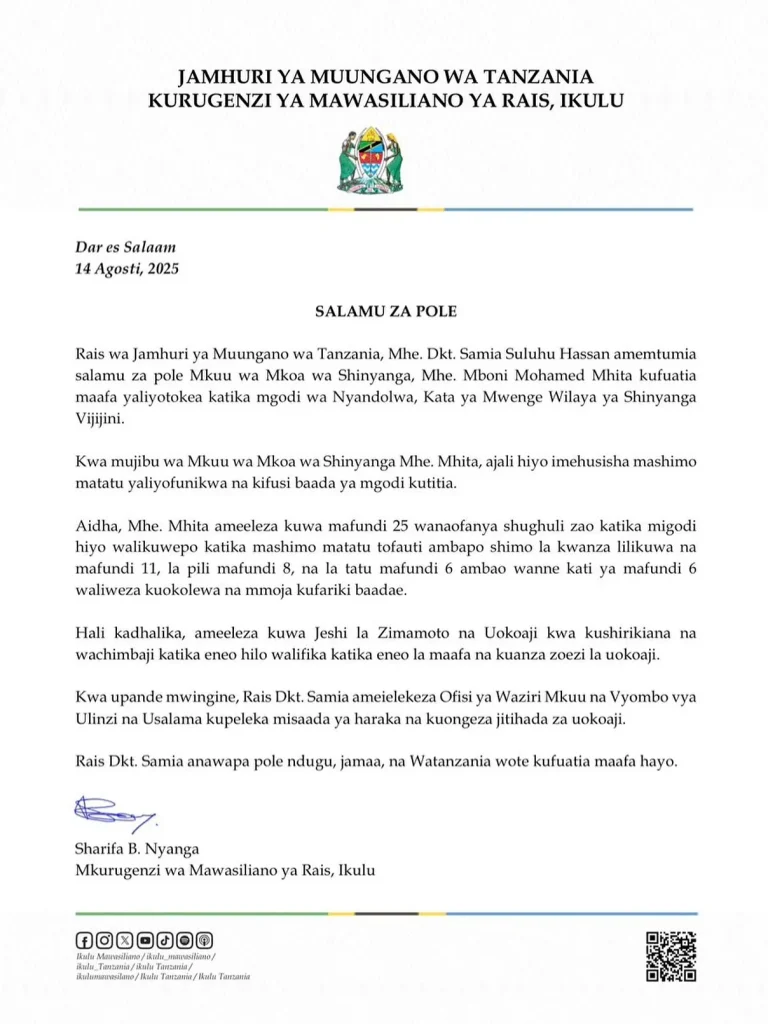 Rais wa Jamhuri ya Muungano wa Tanzania, Dkt. Samia Suluhu Hassan, ametuma salamu za pole kwa wananchi waliokumbwa na janga la kuangukiwa na kifusi katika mgodi uliopo Kijiji cha Mwongozo, Kata ya Mwenge, mkoani Shinyanga