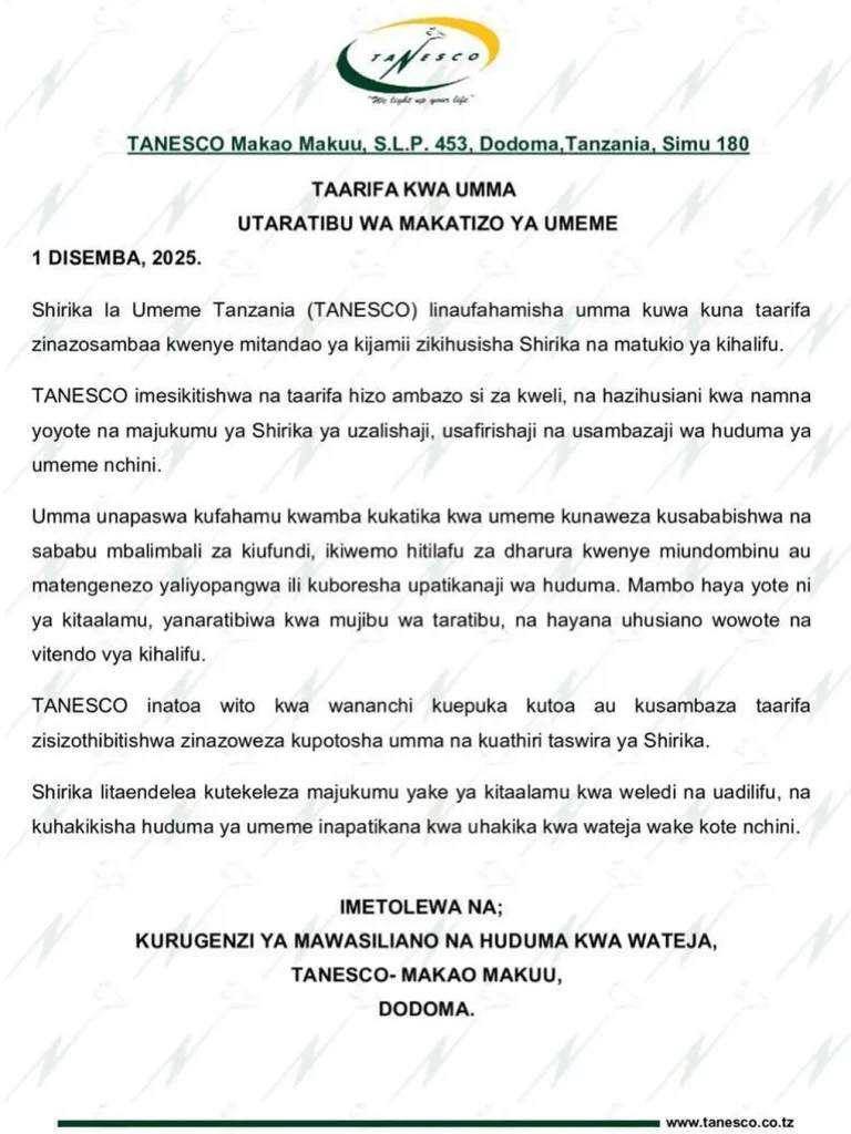 Aidha TANESCO imetoa wito kwa wananchi kuepuka kutoa au kusambaza taarifa zisizothibitishwa zinazoweza kupotosha umma na kuathiri taswira ya Shirika hilo huku lkisisitiza kuwa litaendelea kutekeleza majukumu yake ya kitaalamu kwa weledi na uadilifu, na kuhakikisha huduma ya umeme inapatikana kwa uhakika kwa wateja wake kote nchini.