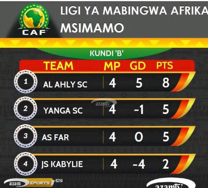 AS FAR Rabat wanashika nafasi ya tatu wakiwa na pointi 5 na tofauti ya mabao 0, huku JS Kabylie ya Algeria ikishika mkia wa kundi kwa pointi 2 na tofauti ya mabao -4.